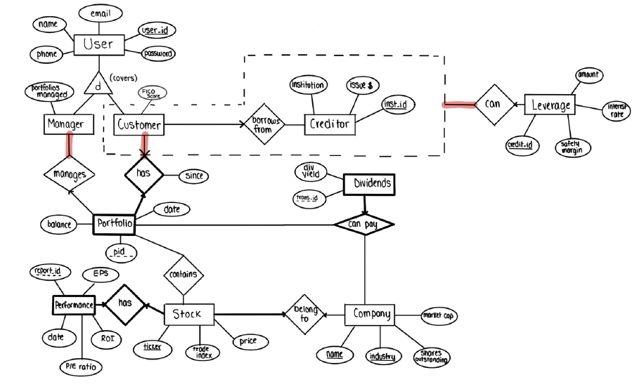 For this project, we were allowed to chose whatever we wanted to do. We focused on doing a stock trading platform. In our platform companies will list their stocks with a trading index and clients would then create their portfolios buy purchasing stocks form the ones available. We used static data provided by the Capital IQ Database. We created two different profiles in our database, Managers and Clients. Clients have accounts containing information like their names, address, birth date, email and other banking information like bank account number. There are many clients but not every client needs to have a portfolio, this was just part of our design decision. This means they can simply have an account with no portfolio. A portfolio consists of a collection of stocks from those available (one of the indexes) and is held by a client. A manager can have many different client portfolios under its command and is allowed to perform transactions on those portolios. Client only directly controls its account information and has access to its own portfolio.